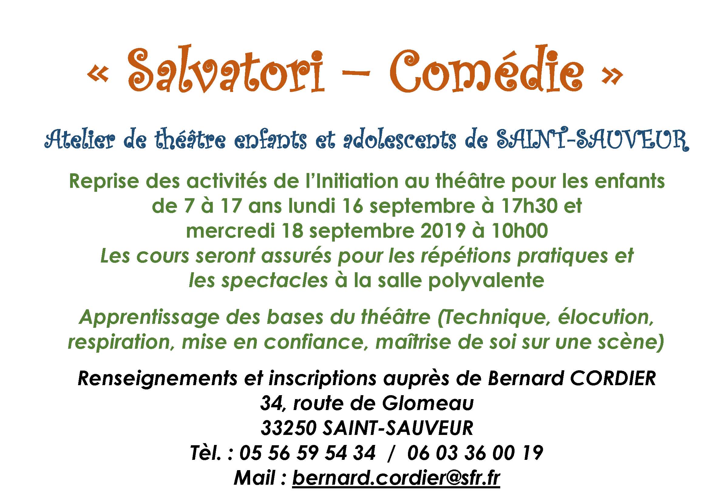 " SALVATORI-COMEDIE " Atelier d'Initiation au théâtre enfants et adolescents Bernard CORDIER ![]() 05 56 59 54 34 06 03 36 00 19 Cette adresse e-mail est protégée contre les robots spammeurs. Vous devez activer le JavaScript pour la visualiser. En savoir plus ... |